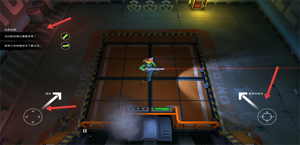 2、進入任務(wù)區(qū)域后利用移動按鍵控制角色移動瞄準并射擊敵人,同時留意任務(wù)安排完成強化器售貨亭和下載日志的任務(wù)。