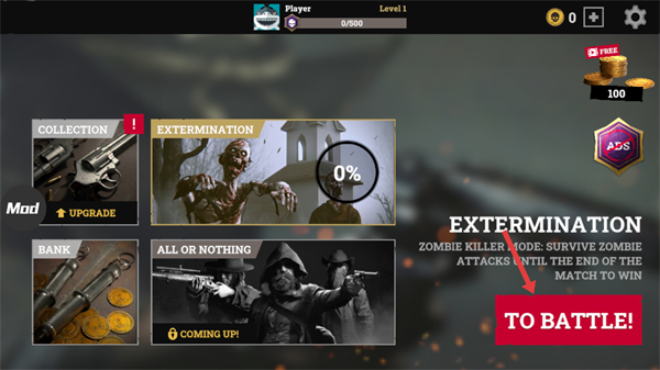 1、選擇EXTERMINATION模式點(diǎn)擊TOBATTLE進(jìn)入戰(zhàn)斗,該模式需在僵尸攻擊中存活到比賽結(jié)束開啟僵尸擊殺挑戰(zhàn)。