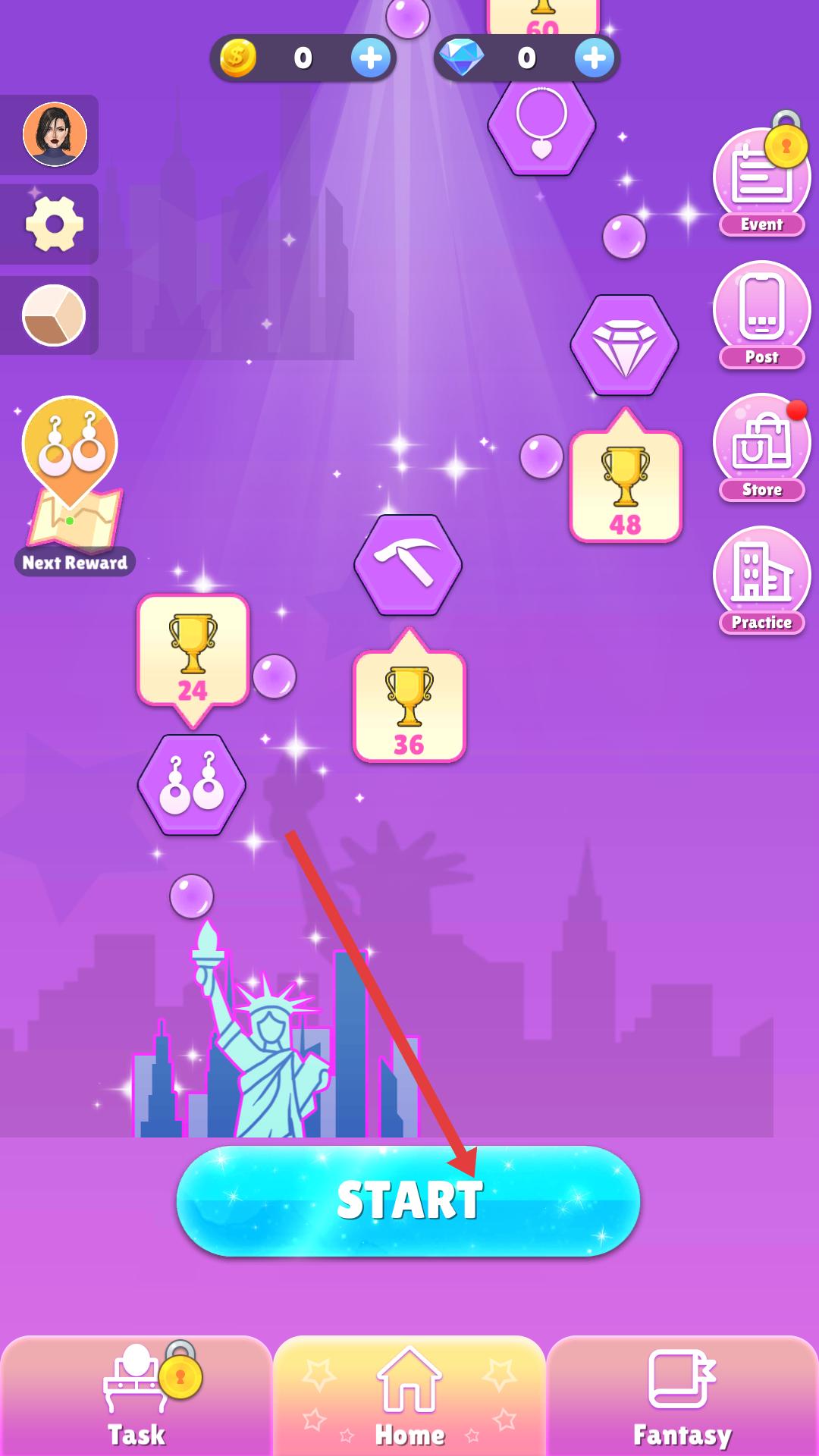 1、點(diǎn)擊START按鈕進(jìn)入游戲,在紐約場景開啟時(shí)尚挑戰(zhàn),可通過完成任務(wù)獲取獎(jiǎng)杯、金幣等資源。