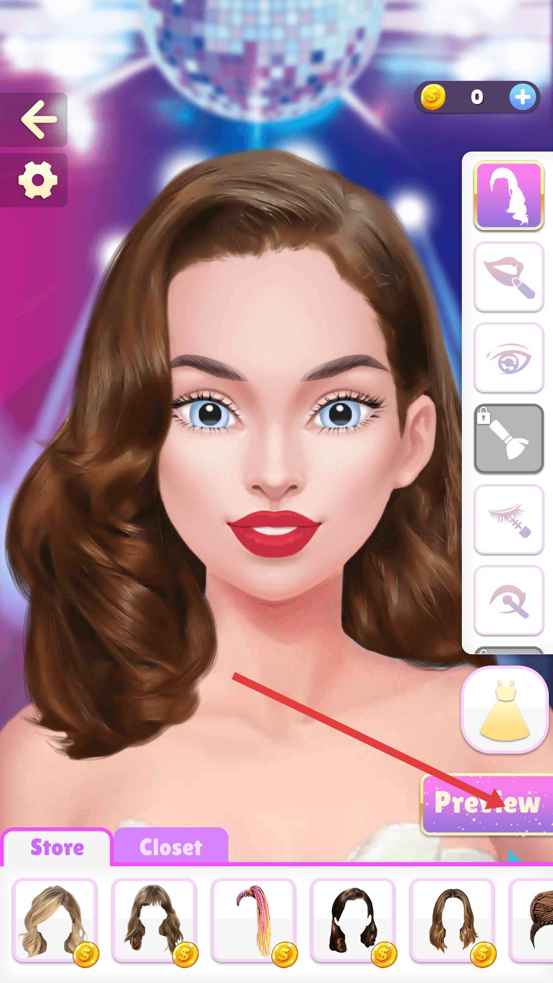 3、切換到發(fā)型與妝容界面,選擇不同的發(fā)型和妝容如紅唇妝,點(diǎn)擊Preview預(yù)覽整體造型效果,調(diào)整搭配細(xì)節(jié)。