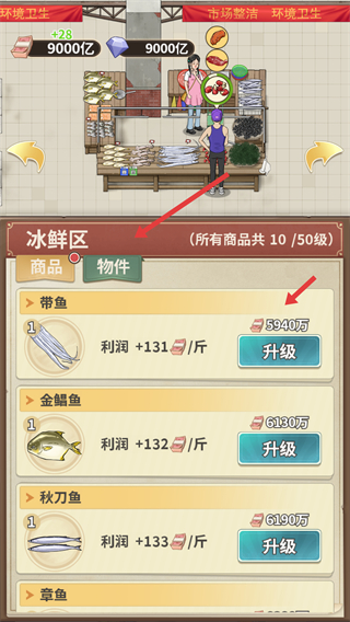 2、進入冰鮮區(qū)商品升級界面消耗資源升級帶魚、金鯧魚等商品提升商品利潤增加市場收益。