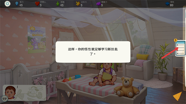 2、當(dāng)悟性足夠時(shí),點(diǎn)擊技能列表可學(xué)習(xí)新技能,如嬰幼兒講話、嬰幼兒走路,學(xué)習(xí)后可提升對(duì)應(yīng)屬性并解鎖技能方向如引人關(guān)注、搭積木塔。
