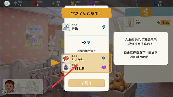 3、學(xué)習(xí)新技能時(shí),可選擇技能方向如引人關(guān)注提升智力,搭積木塔提升想象力,自由決定下一回合學(xué)習(xí)的新技能,持續(xù)探索發(fā)現(xiàn),提升角色各項(xiàng)屬性。