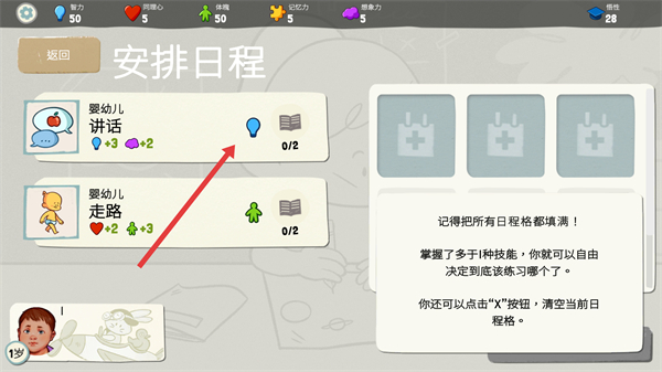 1、在安排日程界面選擇嬰幼兒語(yǔ)、嬰幼兒走路等技能進(jìn)行練習(xí),每種技能可提升對(duì)應(yīng)屬性如講話提升智力、想象力,需將所有日程格填滿,也可自由選擇練習(xí)技能或清空日程格。