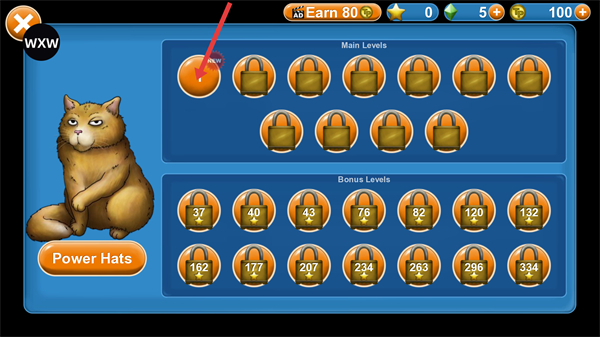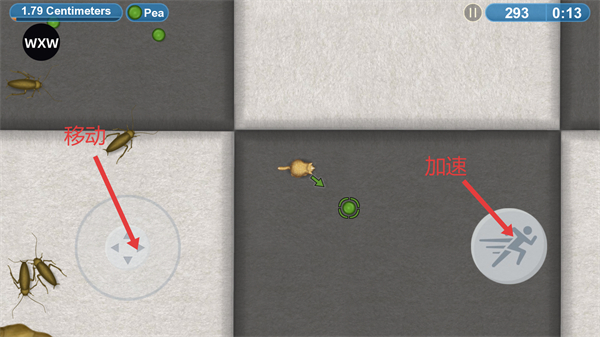 3、進(jìn)入關(guān)卡選擇界面,優(yōu)先選擇解鎖的第1關(guān),操控角色通過移動(dòng)按鈕控制方向,加速按鈕提升移動(dòng)速度,吞噬場(chǎng)景中的物品如豌豆,積累分?jǐn)?shù)。