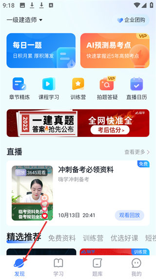 1、發(fā)現(xiàn)頁有每日一題、AI預(yù)測考點等功能,設(shè)章節(jié)精煉等入口,還展示直播與精選推薦內(nèi)容。