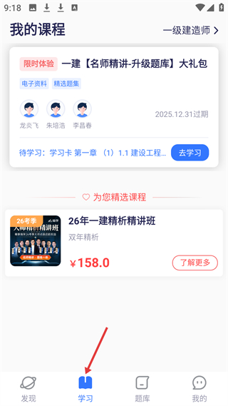 2、學(xué)習(xí)頁呈現(xiàn)我的課程,有一建名師精講大禮包限時體驗,也有26年一建精析精講班等課程推薦。