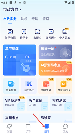 3、題庫頁分市政實務(wù)等科目,含做題數(shù)據(jù)等功能,提供章節(jié)精煉、每日一題等刷題及AI輔助工具。