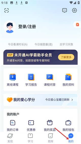 4、我的頁可登錄注冊,展示學(xué)習(xí)數(shù)據(jù),有離線課程等功能,還有訂單、優(yōu)惠券等賬戶管理入口。