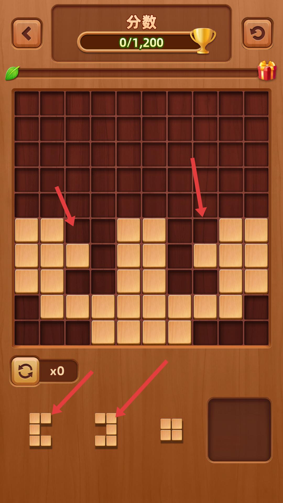 2、觀察棋盤上方塊分布,挑選下方合適的方塊,拖到棋盤空缺處,盡量填滿行或列,以此消除得分,向分數(shù)目標邁進。