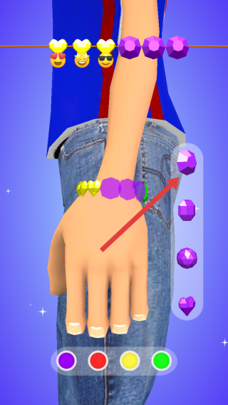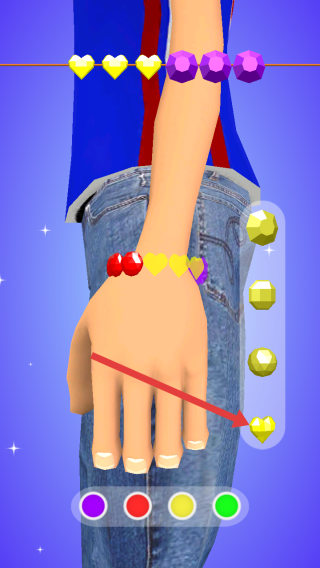 2、進入制作環(huán)節(jié),根據(jù)需求,挑選不同形狀、顏色的珠子將其串到顧客的手腕上,打造手鏈。