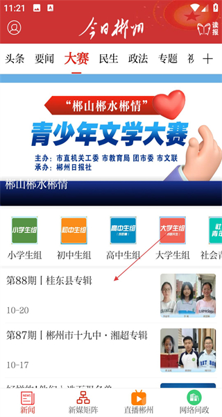 2、切換到大賽板塊,瀏覽郴山郴水郴情青少年文學(xué)大賽資訊,了解各參賽組別和桂東縣專輯內(nèi)容,推進多板塊資訊瀏覽的流程,關(guān)注本地文化賽事動態(tài)。