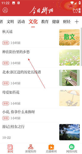 4、切換到文化板塊,瀏覽種在陽臺里的鄉(xiāng)愁資訊,了解本地文化散文內(nèi)容,完成今日郴州軟件多板塊資訊瀏覽的操作流程。