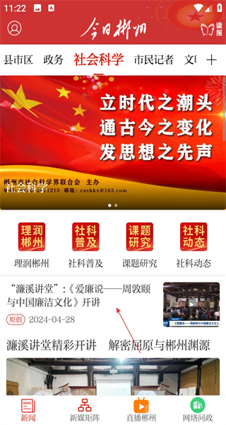 3、切換到社會科學(xué)板塊,瀏覽濂溪講堂愛廉說開講資訊,了解廉潔文化講座內(nèi)容,繼續(xù)完成多板塊資訊瀏覽的步驟,豐富社會科學(xué)知識體驗。
