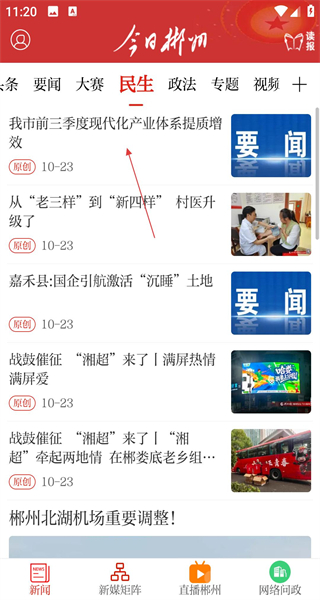 1、打開今日郴州軟件,進入新聞頁面,看到民生板塊,點擊該板塊,瀏覽我市前三季度現(xiàn)代化產(chǎn)業(yè)體系提質(zhì)增效資訊,了解本地產(chǎn)業(yè)發(fā)展情況。