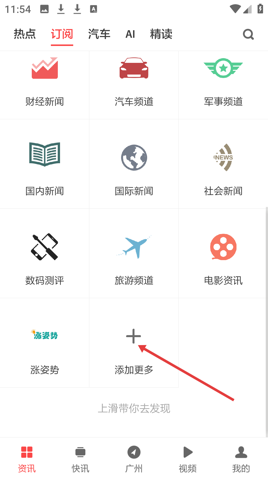 1、進入資訊頁找到訂閱欄,這里可以瀏覽已展示頻道,若想添加更多就點擊添加更多按鈕,進入頻道發(fā)現(xiàn)頁面,這里有豐富分類頻道待選擇,開啟訂閱拓展第一步。