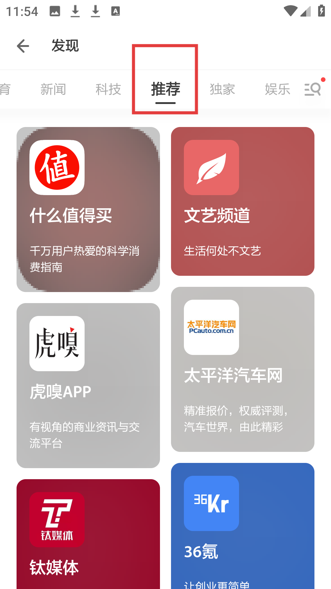 2、發(fā)現(xiàn)頁面這里羅列眾多優(yōu)質內容源,像什么值得買、文藝頻道等,用戶可以滑動瀏覽找到自己感興趣的頻道,點擊進入詳情頁為添加訂閱做準備。