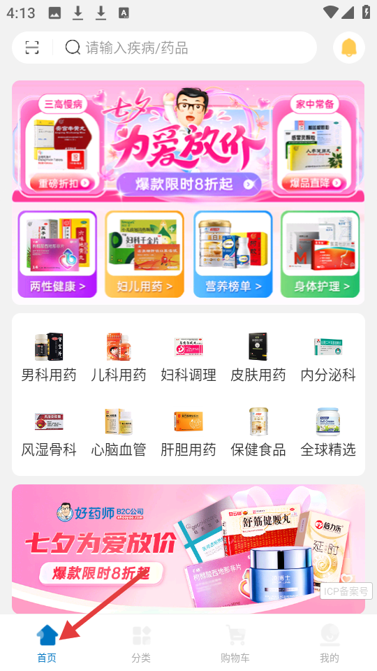 1、首頁設(shè)有搜索欄,能查找疾病或藥品,正推七夕為愛放價(jià)活動(dòng),涵蓋兩性健康等多樣分類展示豐富藥品品類。