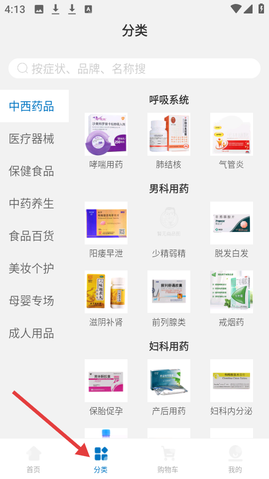 2、分類界面支持按癥狀等搜索,劃分中西藥品、醫(yī)療器械等大項(xiàng),每個(gè)大項(xiàng)又細(xì)分如呼吸系統(tǒng)男科用藥等便于精準(zhǔn)查找。