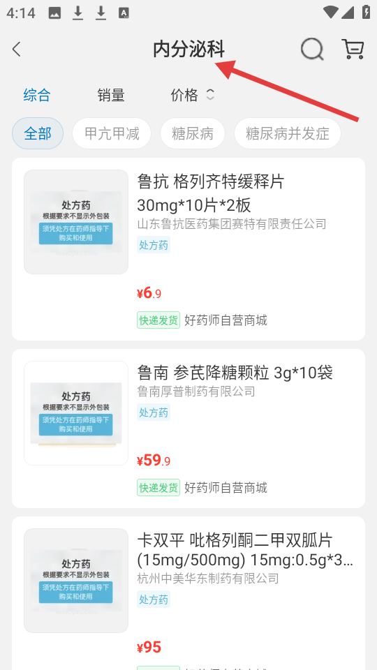 3、內(nèi)分泌科藥品展示頁,陳列魯抗格列齊特緩釋片等處方藥,標(biāo)注價(jià)格、規(guī)格等信息,提供綜合、銷量價(jià)格等篩選方式。