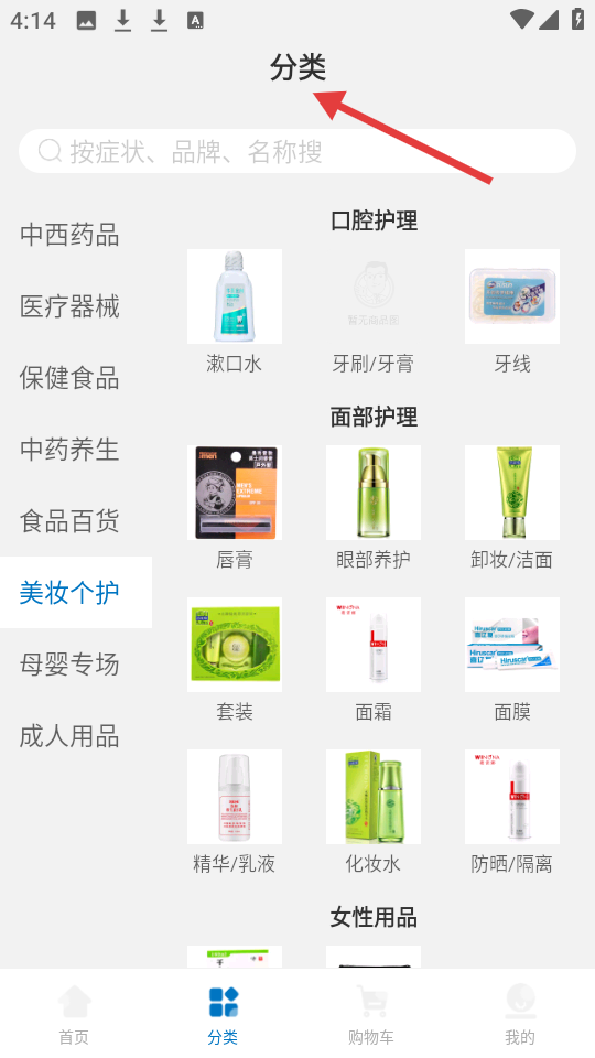 4、美妝個(gè)護(hù)分類頁,包含口腔護(hù)理與面部護(hù)理等類別,展示漱口水、唇膏、面霜等多樣產(chǎn)品滿足不同護(hù)理需求。