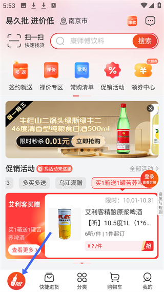 1、首頁定位南京,有搜索欄,設(shè)簽約就送、裸價專區(qū)等功能區(qū),展示牛欄山二鍋頭秒殺活動與艾利客啤酒買贈底部是導(dǎo)航欄。