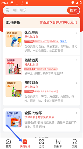 2、快捷進貨頁面可搜索商品,分本地進貨和全國批包郵,本地進貨含休百糧調(diào)、暢銷酒類等分類介紹優(yōu)惠活動。