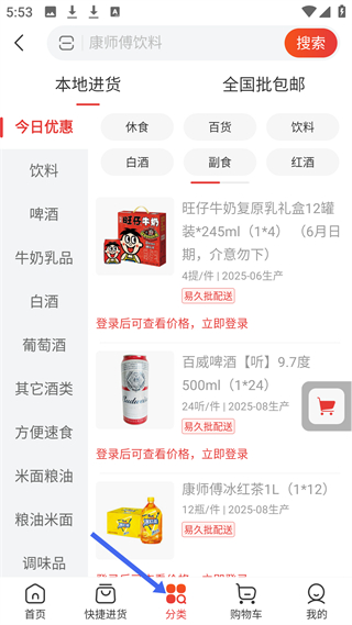 3、分類頁面能搜索商品,分本地進貨與全國批包郵,本地進貨有今日優(yōu)惠及飲料、啤酒等品類,展示旺仔牛奶等商品。