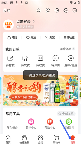 4、我的頁面可點擊登錄體驗更多功能,有常購、關(guān)注等板塊,顯示訂單狀態(tài),還有常用工具與促銷活動。