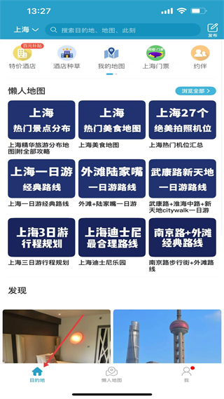 1、目的地板塊聚焦上海,有熱門景點(diǎn)分布、美食地圖等懶人地圖,還有特價(jià)酒店、約伴等服務(wù),助力上海旅行。