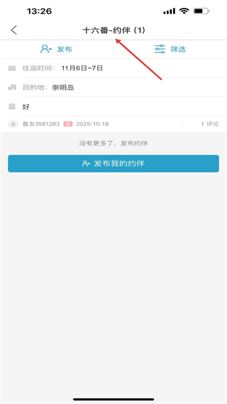 3、十六番約伴板塊,可發(fā)布約伴信息,示例中是11月6、7日去崇明島的約伴,方便找到同行者。