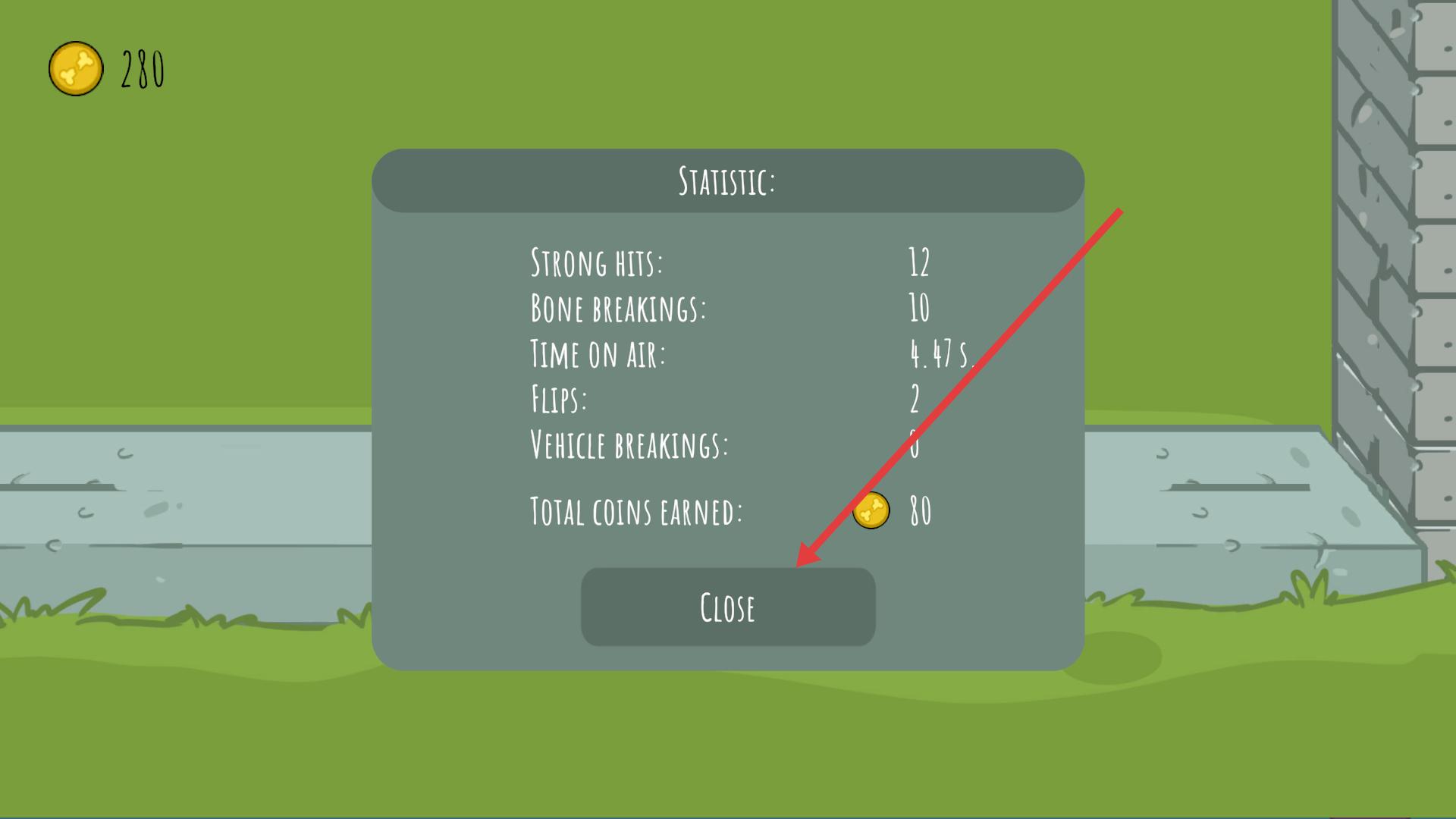 4、冒險(xiǎn)結(jié)束后界面會(huì)彈出統(tǒng)計(jì)窗口,顯示強(qiáng)擊次數(shù)斷骨次數(shù)等數(shù)據(jù),點(diǎn)擊Close按鈕,關(guān)閉統(tǒng)計(jì)窗口可選擇繼續(xù)挑戰(zhàn)其他關(guān)卡,開(kāi)啟新的冒險(xiǎn)。