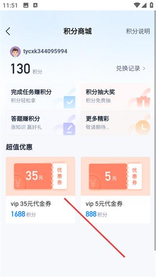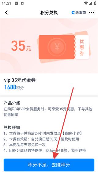 2、在積分商城選擇vip35元代金券,進(jìn)入積分兌換頁面,查看代金券的兌換積分要求、產(chǎn)品介紹和兌換須知。