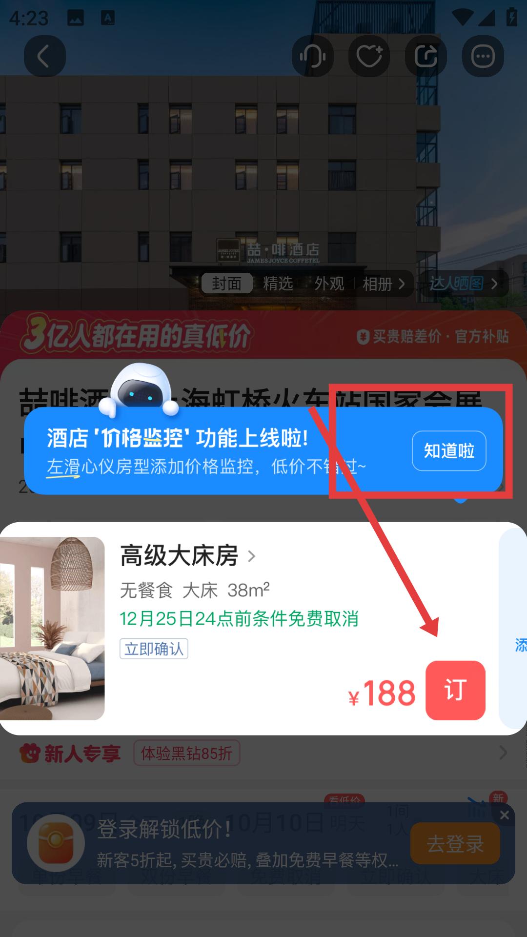 3、在酒店詳情頁面,若彈出酒店價(jià)格監(jiān)控’功能上線啦的提示框,點(diǎn)擊知道啦關(guān)閉提示,然后查看酒店房型等信息,選擇合適房型。