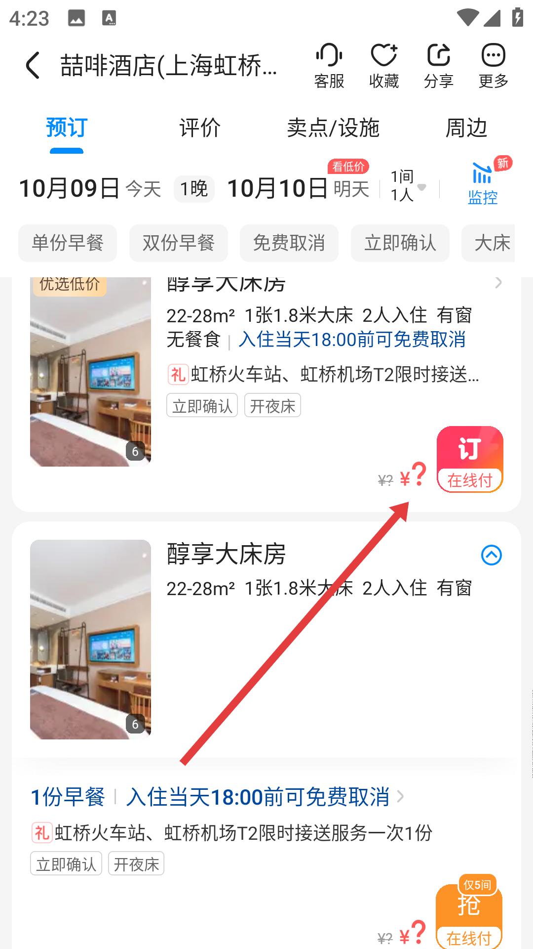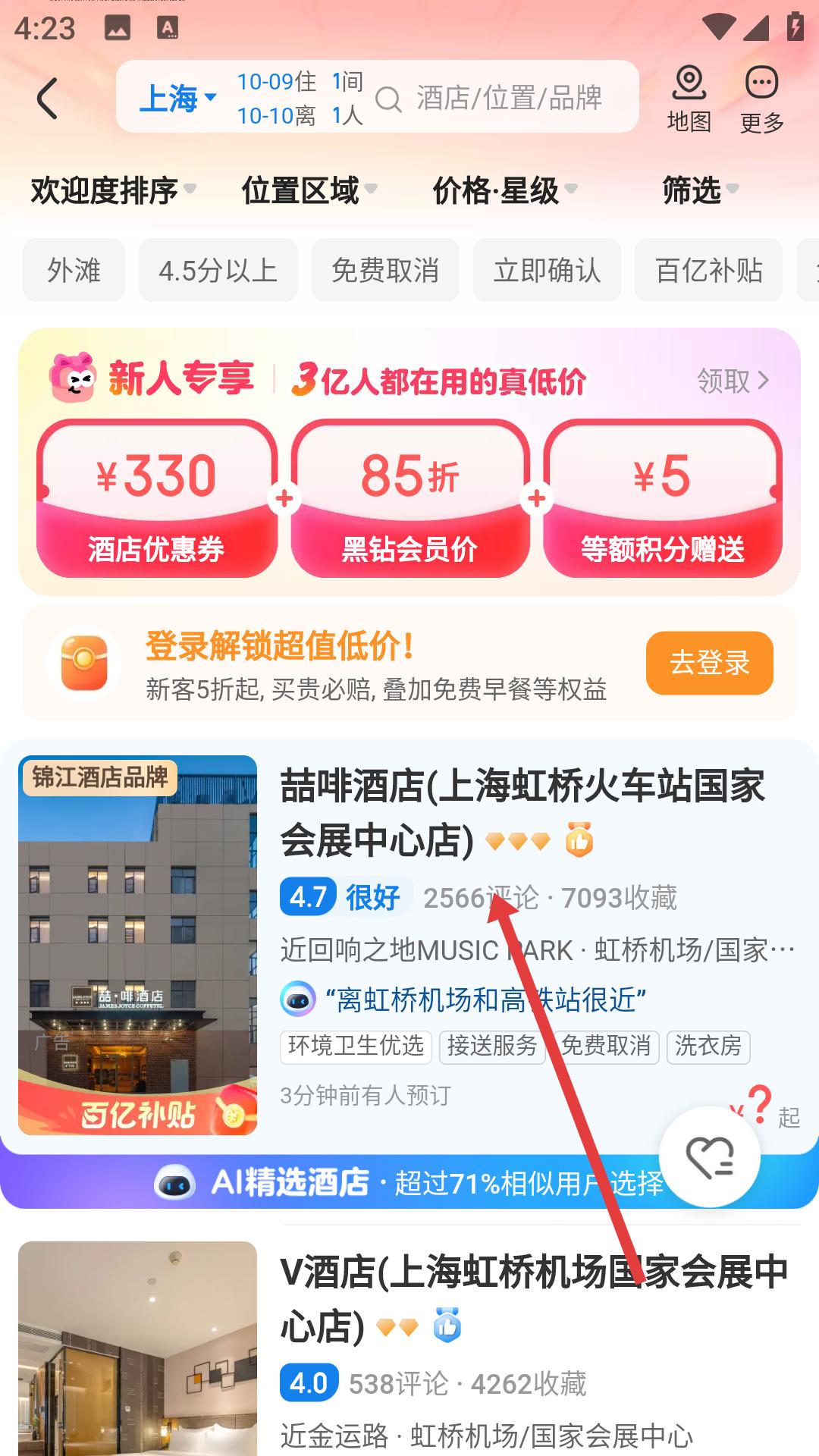 2、進(jìn)入酒店預(yù)訂頁面后,在眾多酒店中找到心儀的喆啡酒店上海虹橋火車站國家會(huì)展中心店,點(diǎn)擊該酒店,進(jìn)入酒店詳情頁面。