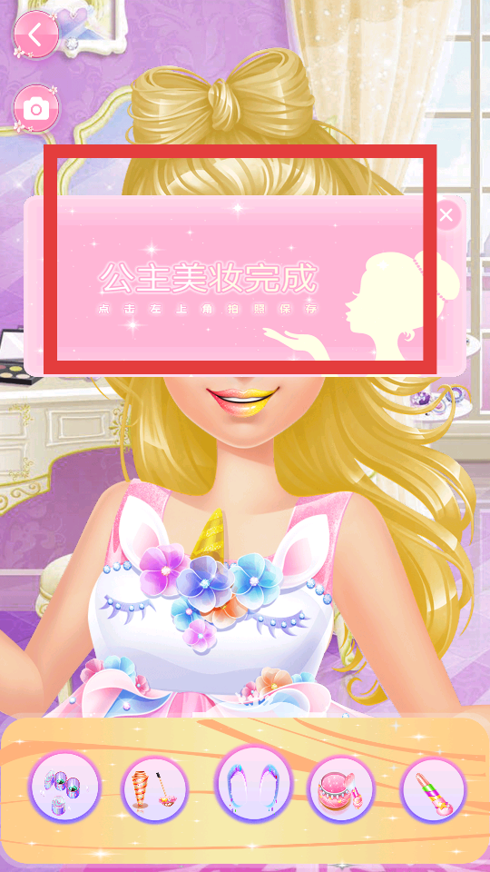 4、當(dāng)完成對(duì)公主的美妝打扮后,會(huì)彈出公主美妝完成提示,點(diǎn)擊左上角的拍照按鈕,即可保存你打造的公主美妝形象。