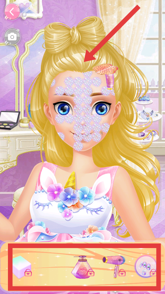 3、在化妝界面下方會(huì)有各類化妝道具和工具,如護(hù)膚品、吹風(fēng)機(jī)等,點(diǎn)擊相應(yīng)道具給公主進(jìn)行面部清潔、發(fā)型打造等化妝步驟。