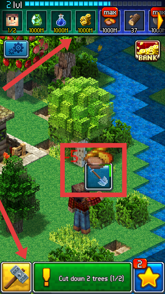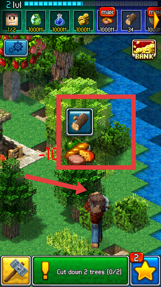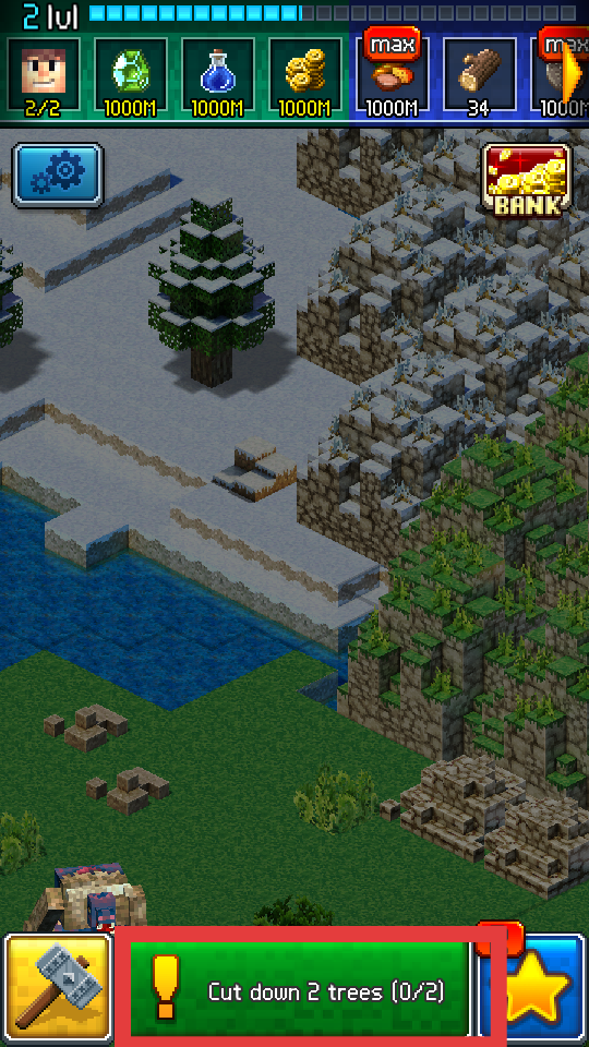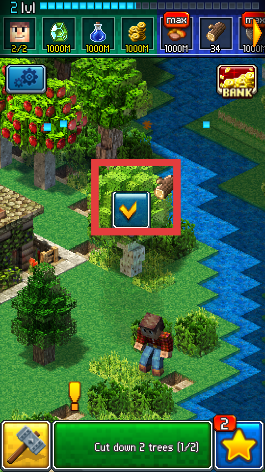 1、玩家進入在游戲界面下方綠色區(qū)域會顯示當前任務,比如Cut down2trees,即砍伐兩棵樹,要隨時留意任務內(nèi)容。