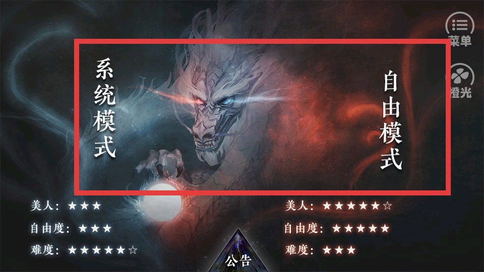 1、玩家下載游戲之后在游戲初始界面,可根據(jù)自身喜好選擇系統(tǒng)模式或自由模式,不同模式有不同的游戲體驗和難度等設定。