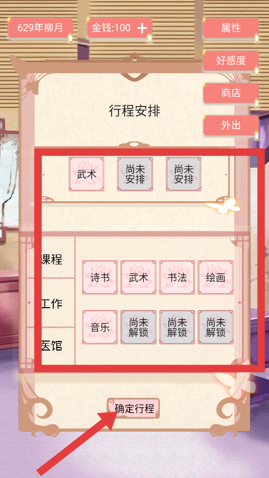 4、玩家在行程安排界面,可選擇詩書、武術等課程或其他活動來規(guī)劃角色的日程,不同選擇會影響角色發(fā)展。