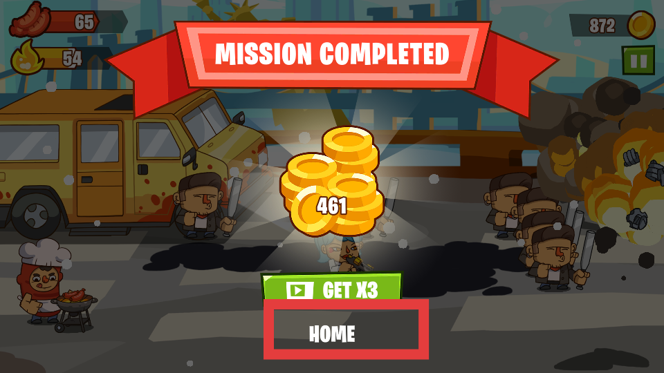 4、在完成任務(wù)后玩家可獲得金幣的獎(jiǎng)勵(lì)點(diǎn)擊HOME按鈕,可以從任務(wù)結(jié)算界面返回游戲主界面,方便玩家進(jìn)行新任務(wù)選擇、資源管理等其他操作。