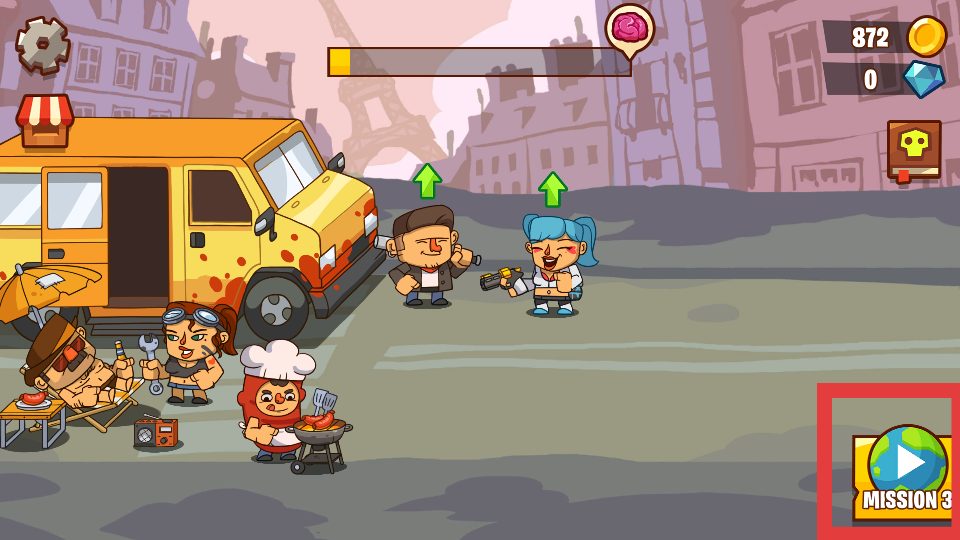 1、在游戲主界面點(diǎn)擊類似地球儀并標(biāo)注MISSION3的按鈕,可以進(jìn)入任務(wù)關(guān)卡選擇界面,挑選想要挑戰(zhàn)的關(guān)卡,開(kāi)啟新的僵尸防御任務(wù)。