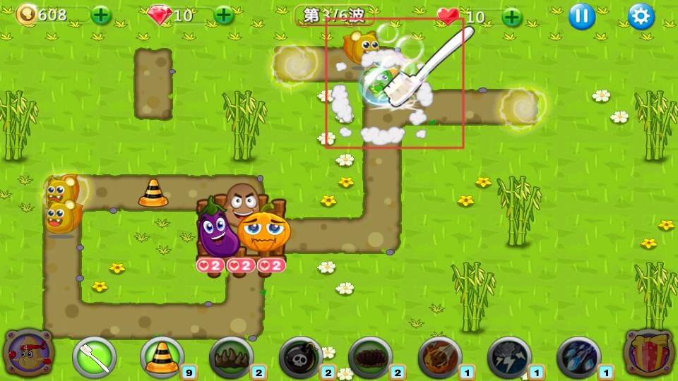 2、敵人來襲時(shí),蔬菜戰(zhàn)士會(huì)自動(dòng)攻擊,也可使用道具輔助,比如用刷子類道具對(duì)敵人進(jìn)行特殊打擊,阻攔敵人前進(jìn)。
