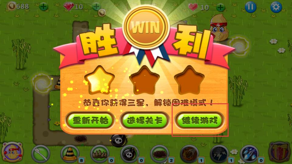 3、成功抵御所有波次敵人后,關(guān)卡勝利,可選擇重新開始、選擇其他關(guān)卡或繼續(xù)游戲,挑戰(zhàn)更難的關(guān)卡。
