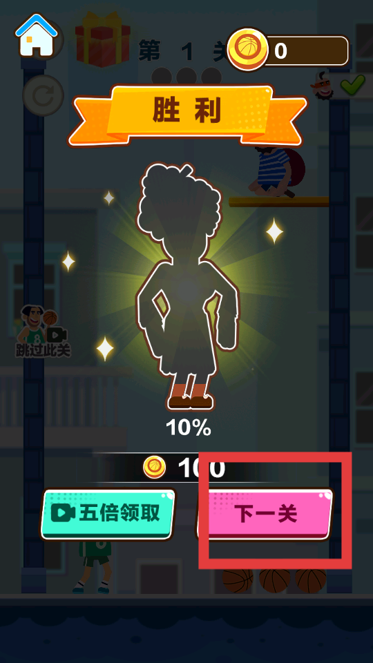 4、通關(guān)后點(diǎn)擊下一關(guān)進(jìn)入新關(guān)卡挑戰(zhàn),不斷提升投籃技巧,還可選擇五倍領(lǐng)取觀看廣告獲取更多金幣,用于解鎖獎(jiǎng)勵(lì)。