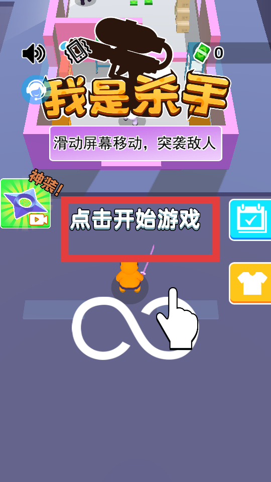 1、玩家下載游戲之后然后點擊進入點擊圖標點擊開始游戲按鈕,進入游戲場景,開啟殺手的冒險之旅。