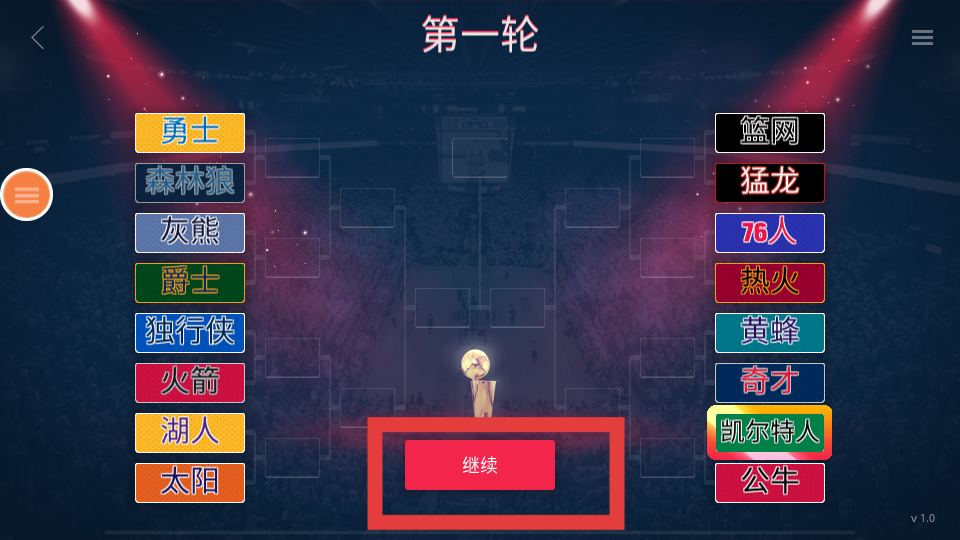 2、然后玩家進(jìn)入賽事輪次界面如第一輪后,玩家即可點(diǎn)擊繼續(xù)按鈕,即可開啟該輪次的籃球?qū)Q。