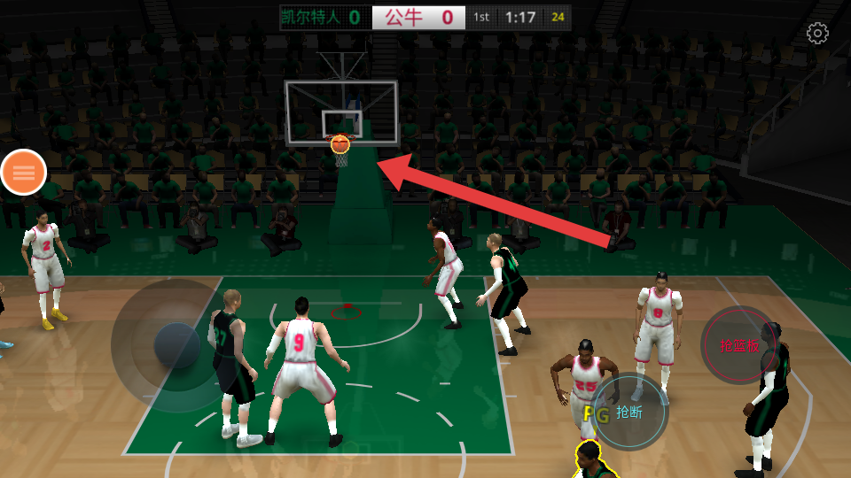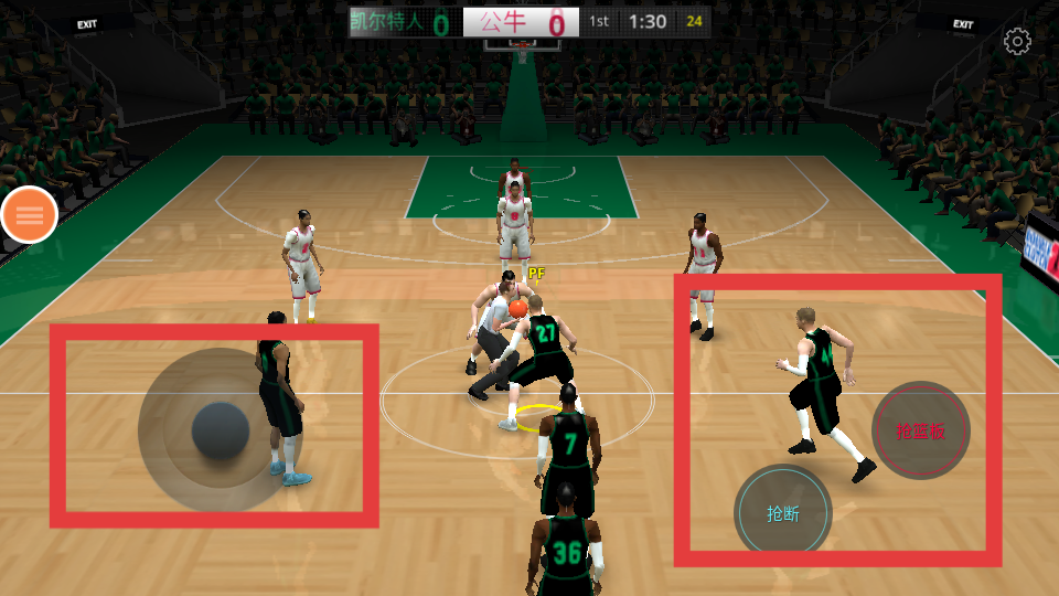3、比賽過程中通過左側(cè)虛擬搖桿操控球員移動,利用右側(cè)搶斷、搶籃板等按鈕,進(jìn)行戰(zhàn)術(shù)操作,爭奪籃球控制權(quán),突破對方防守。