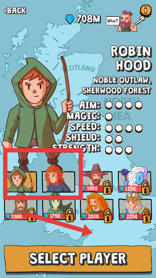 2、進(jìn)入角色選擇界面,可選用初始解鎖的羅賓漢等角色,也可攢鉆石解鎖新角色關(guān)注角色屬性,根據(jù)對(duì)戰(zhàn)需求選合適角色,點(diǎn)擊SELECT PLAYER確認(rèn)。