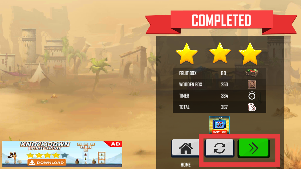 4、在關卡完成界面查看獲得的星級評價和獎勵數(shù)值,點擊綠色箭頭按鈕可進入下一關,點擊循環(huán)箭頭按鈕則可重新挑戰(zhàn)當前關卡,爭取更高分數(shù)和星級。